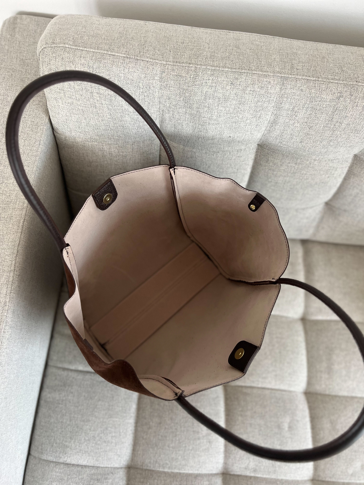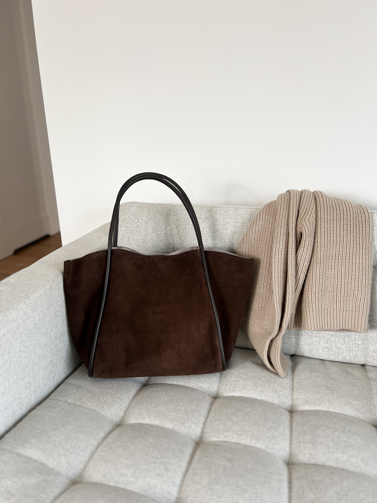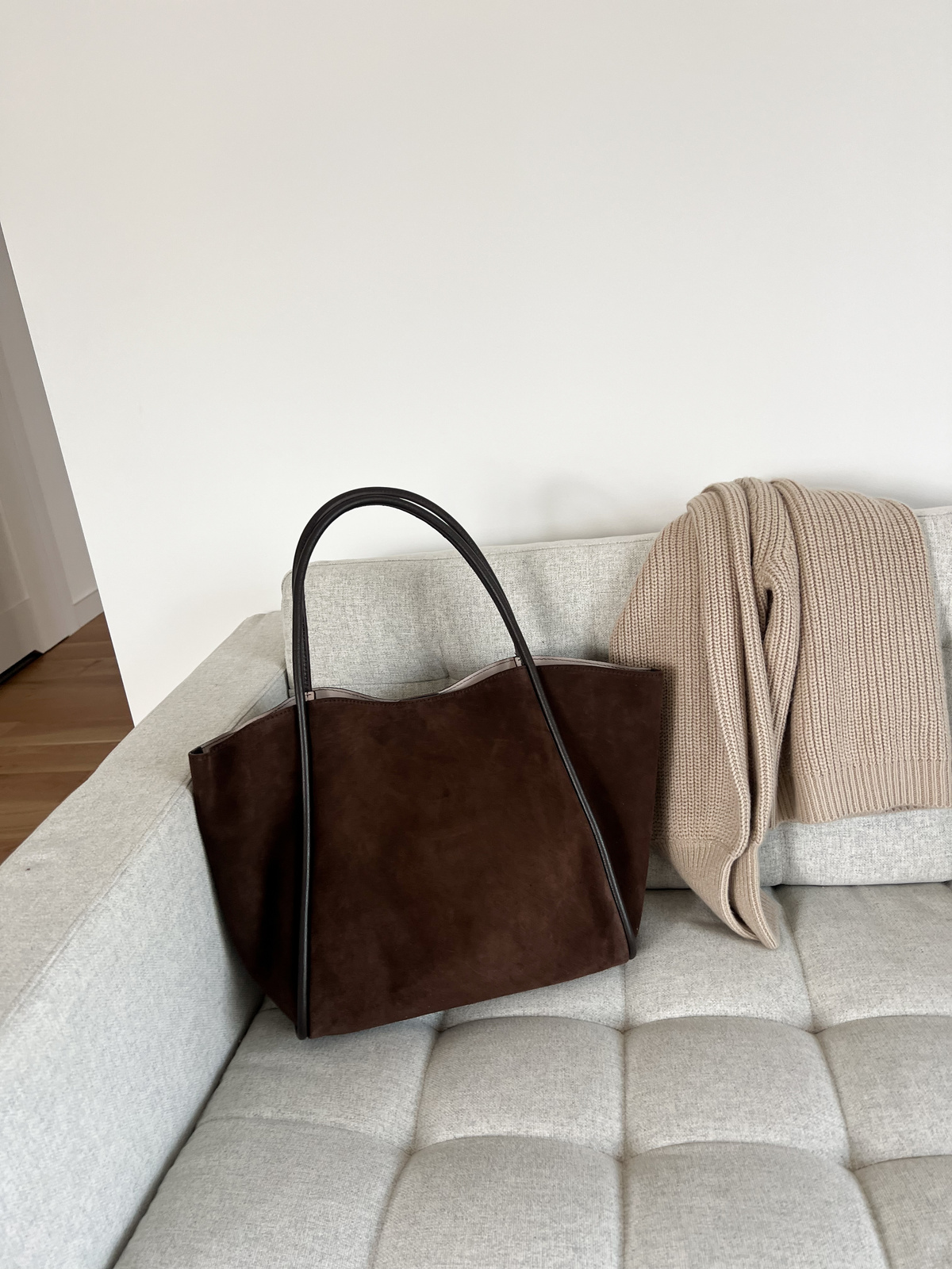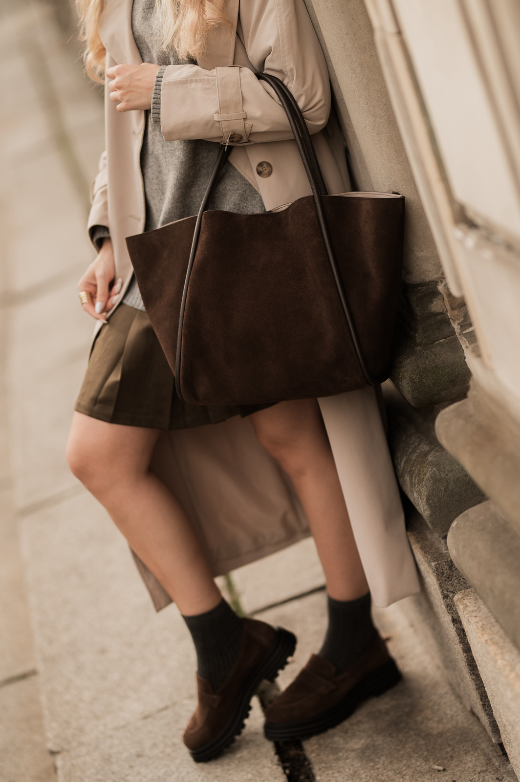Piękna, stylowa shopperka. Idealna na codzień, pomieści dosłownie wszystko. Zmieścisz do niej laptop. W środku dodatkowa kosmetyczna, która można wyjąć. Uszyta ze skóry zamszowej.
