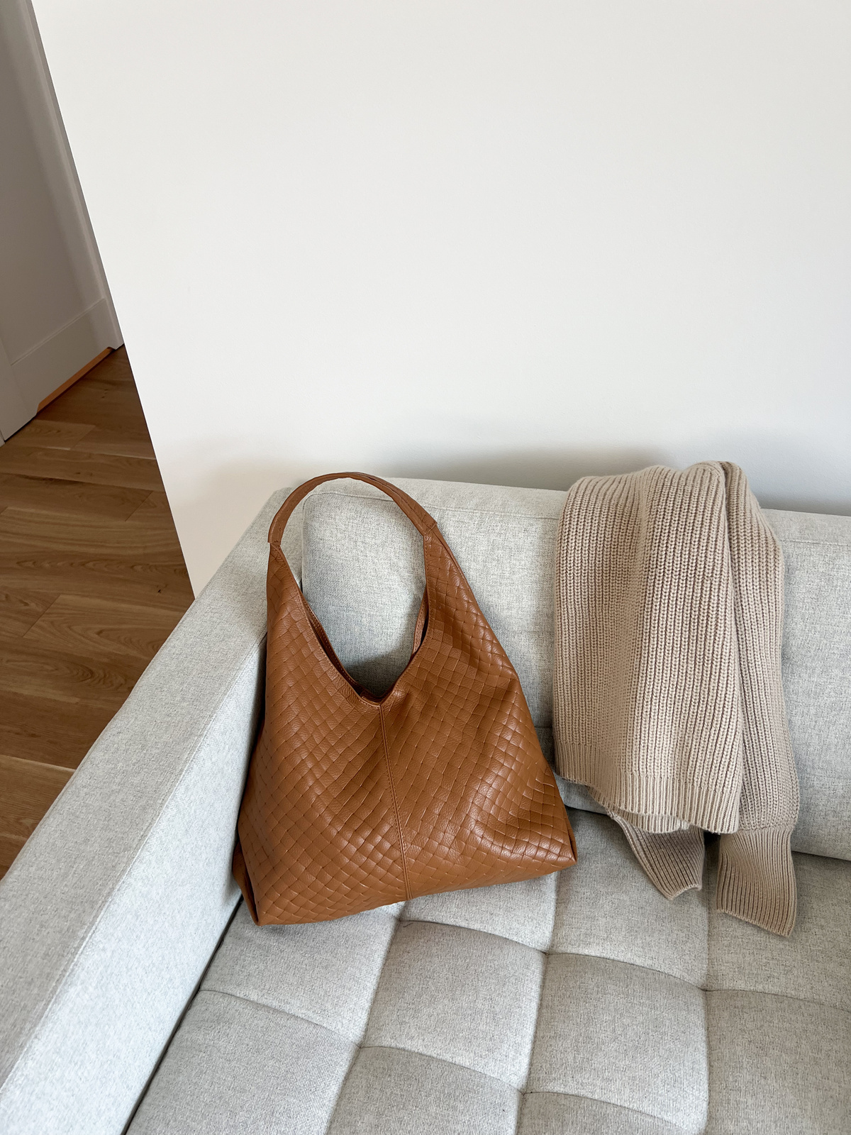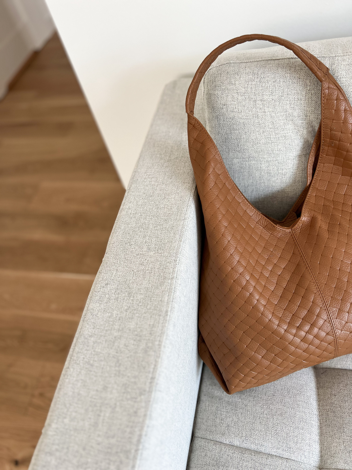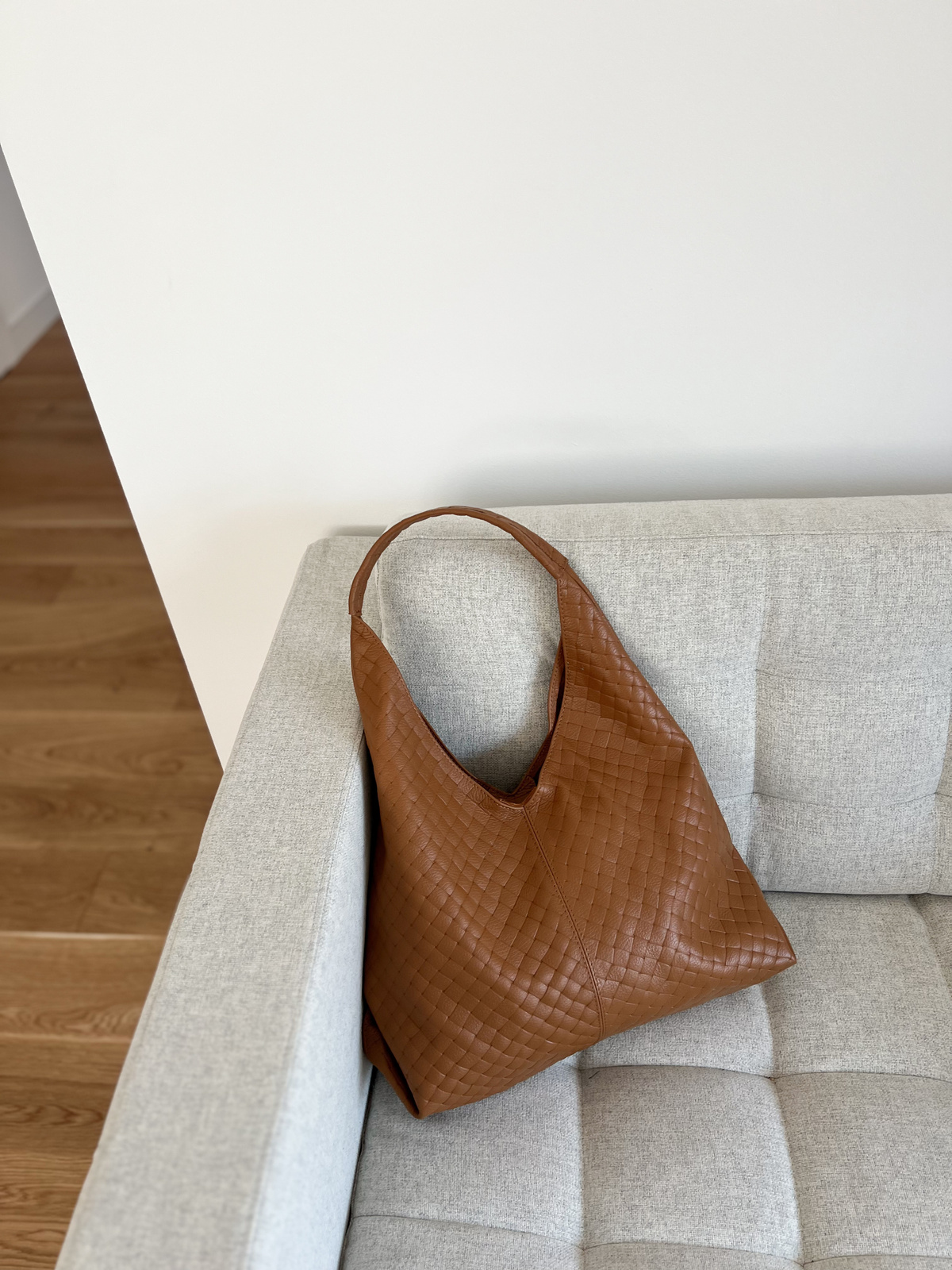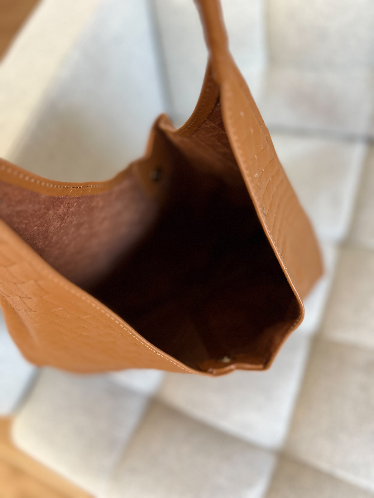 Stylowa, shopperka typu worek. Pojemna, wygodna. Uszyta z plecionej skory. Dodatkowa kosmetyczka z paskiem, która można nosić osobno. Wymiary: Mierzona na płasko: wysokość: 55cm, szerokość 40cm. wysokość ucha: 26cm