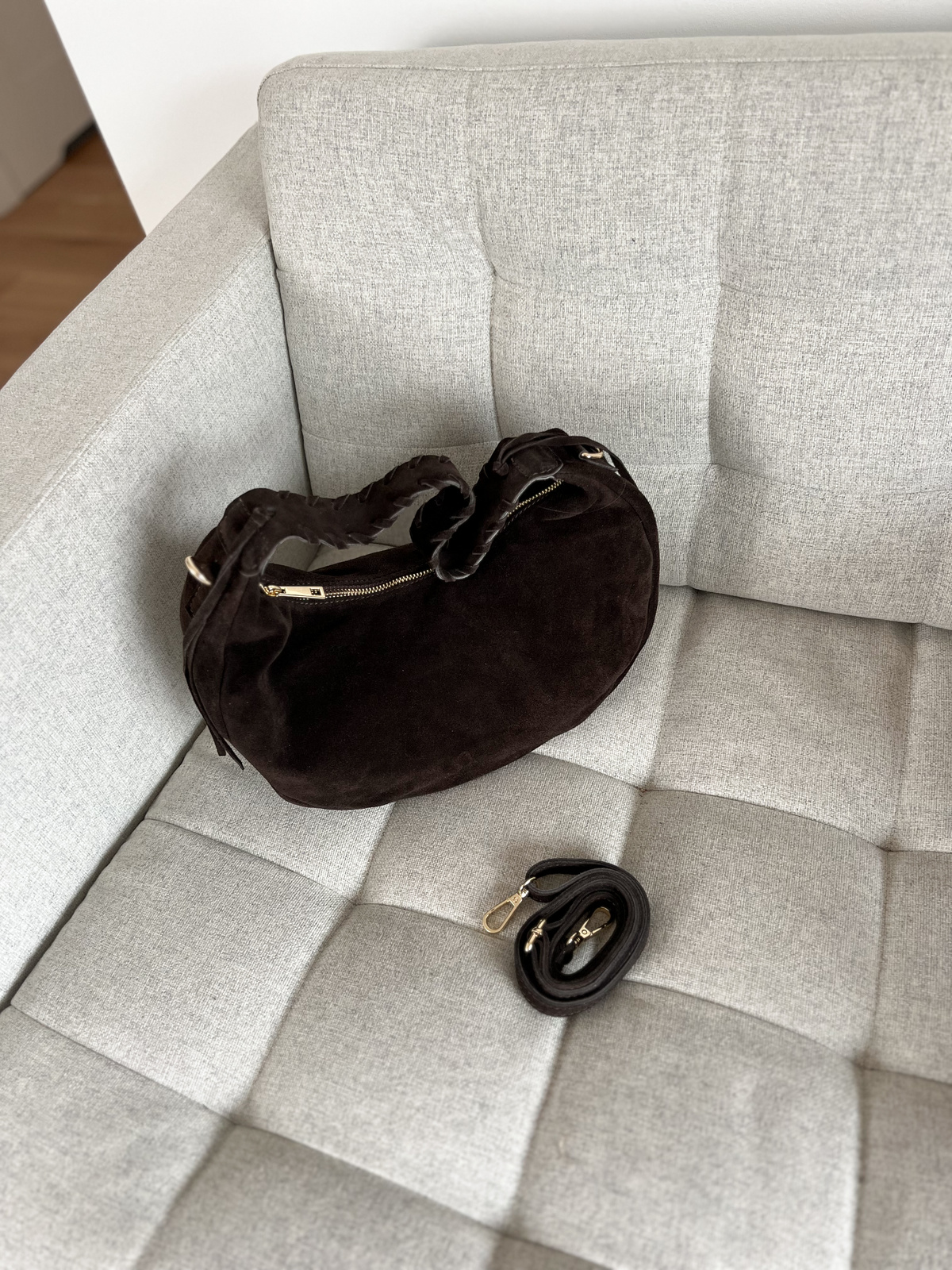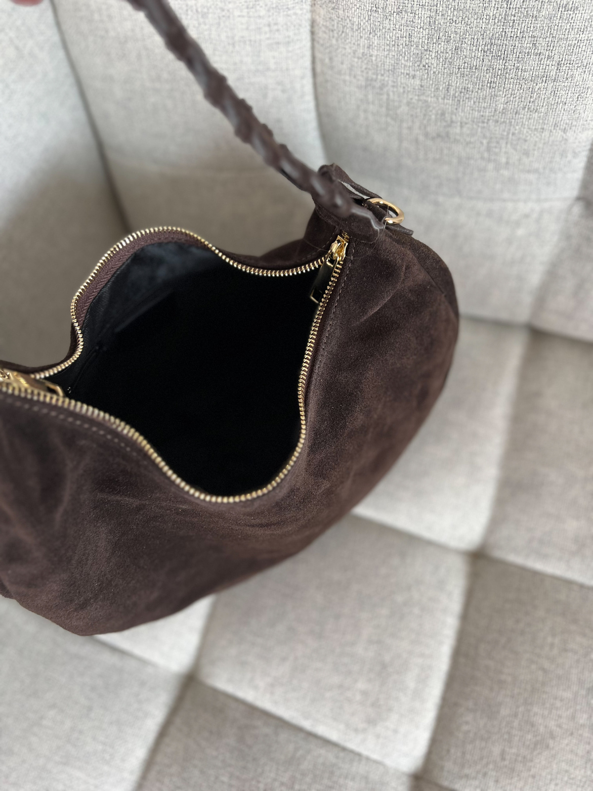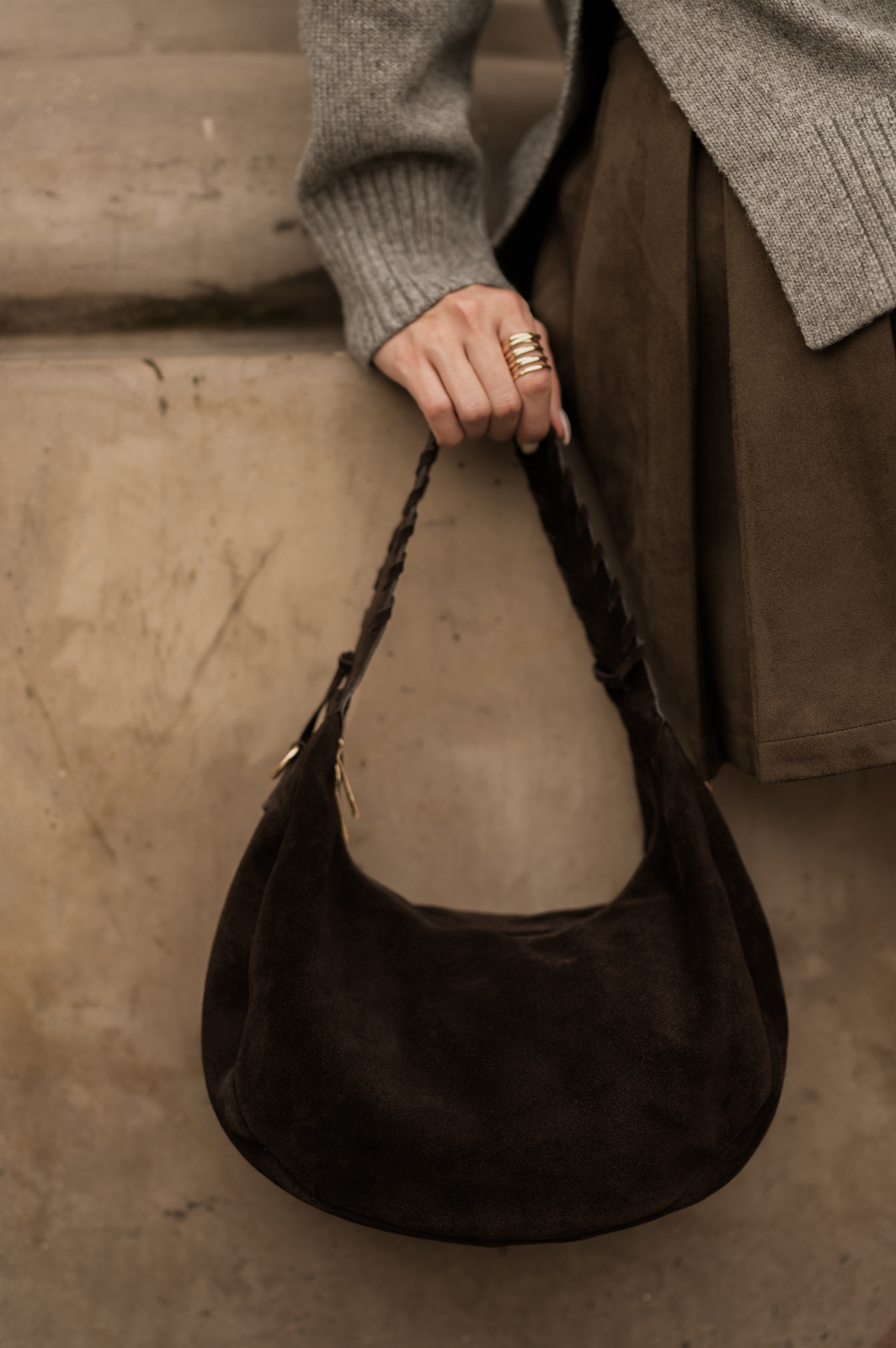Stylowa torebka w stylu boho. Uszyta ze skóry zamszowej. Pleciony ozdobny pasek oraz frędzle nadają jej charakteru. Pojemna, idealna na co dzień. Dzięki dodatkowemu, odpinanemu paskowi, można nosić ją na kilka sposobów.