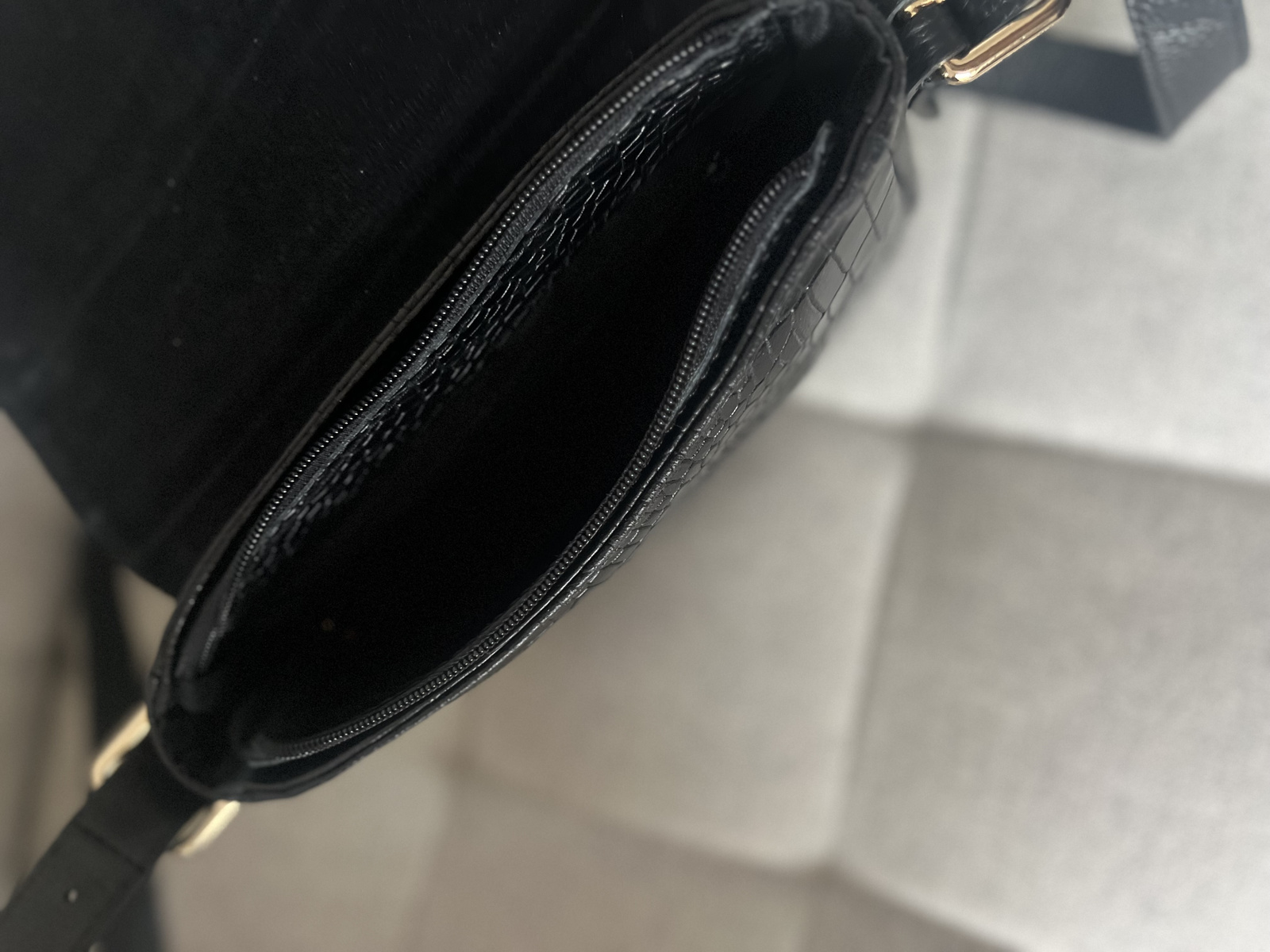 Klasyczna listonoszka. Torba jest pojemna i wygodna, pomieści wszystkie najpotrzebniejsze rzeczy. W środku jedna przegroda i kieszonka na drobiazgi. Z tylu dodatkowa kieszonka na suwak. Idealna na co dzień.