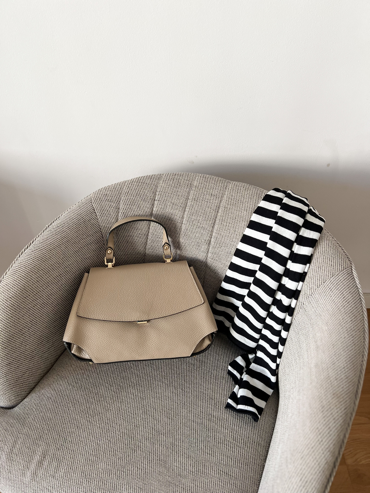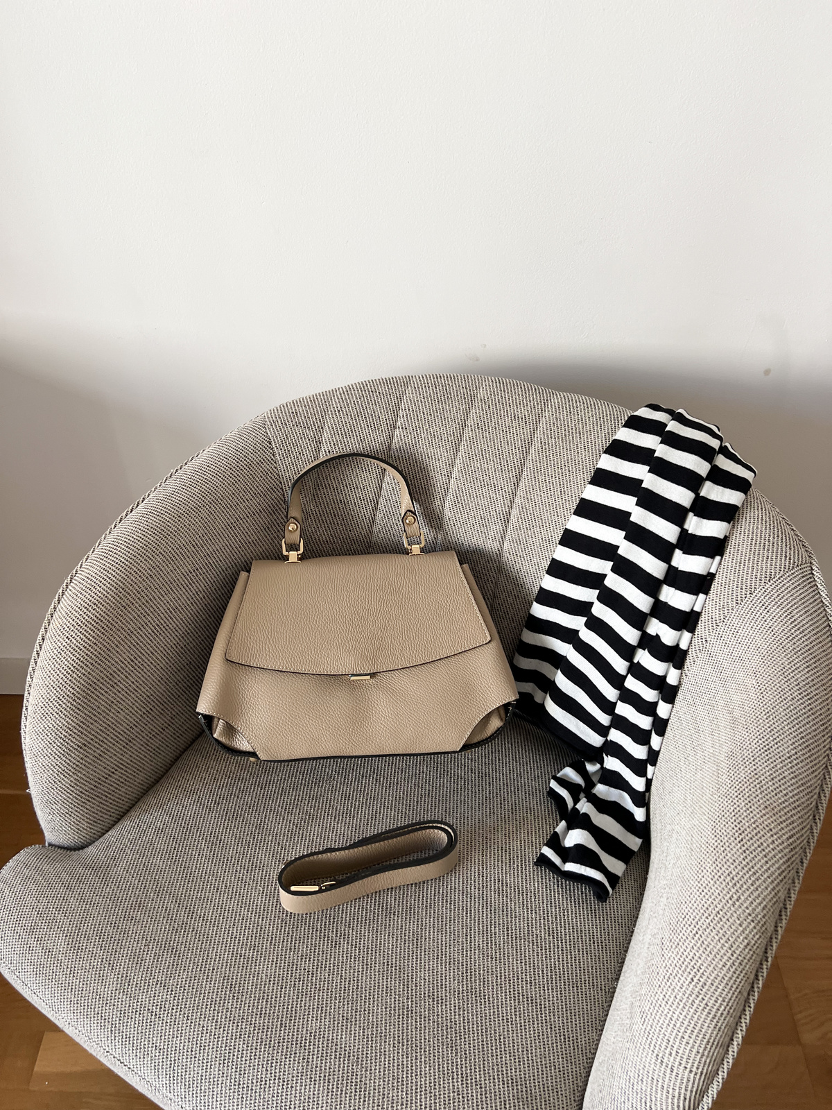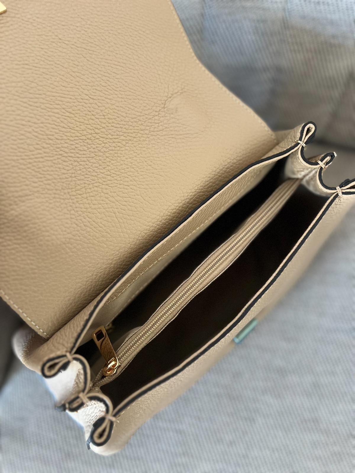 Wyjątkowa, stylowa torebka uszyta ze skory licowej. Idealnie sprawdzi się na co dzień (jest bardzo pojemna!) a także przy okazji bardziej eleganckiej uroczystości. W środku dwie przegrody oraz dwie kieszenie zapinane na suwak. Podszewka. Posiada dodatkowy pasek, dzięki czemu można nosić ja na kilka sposobów. Wymiary: wysokość: 23cm, szerkość 32cm, głębokość: 14cm Pasek: 71cm