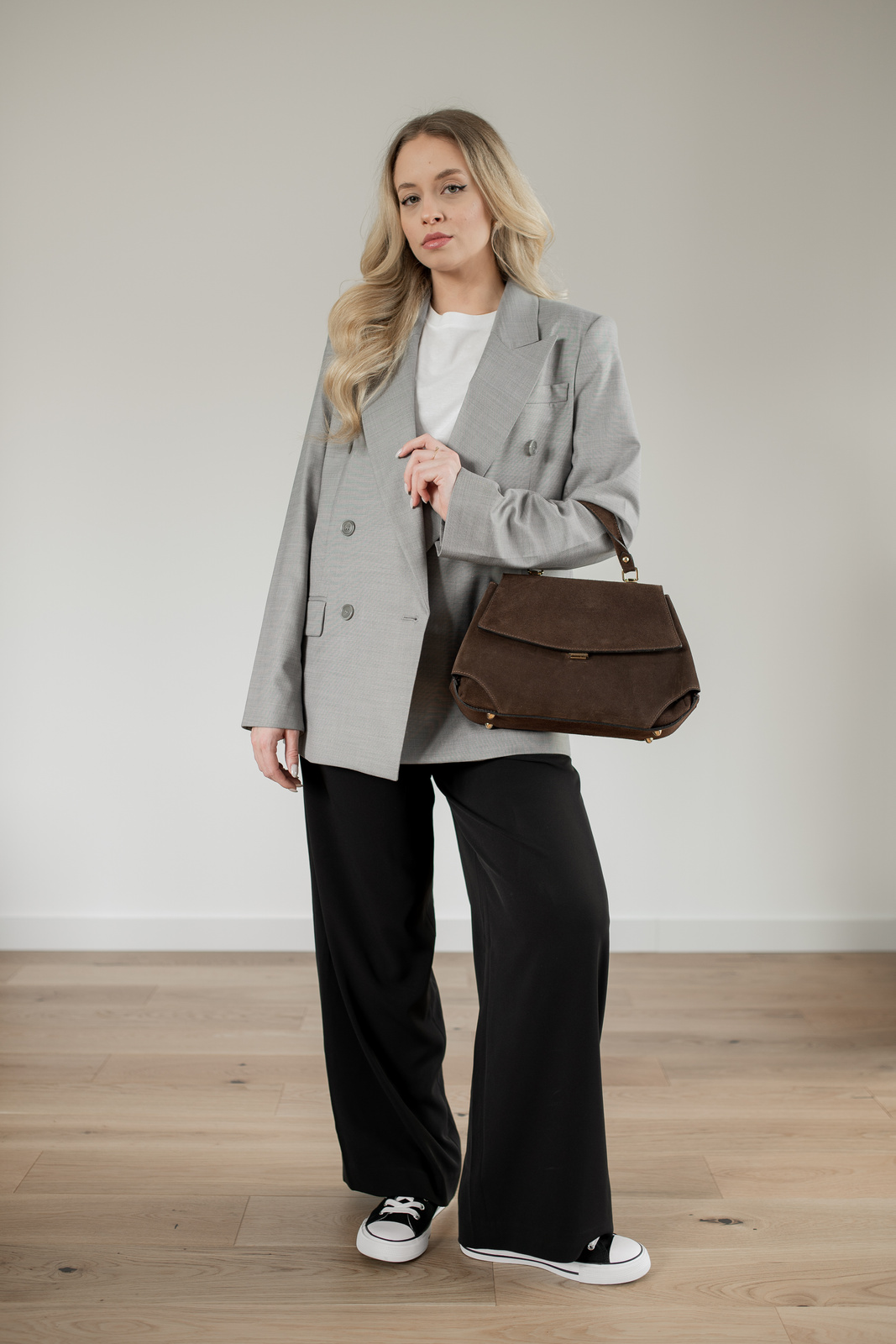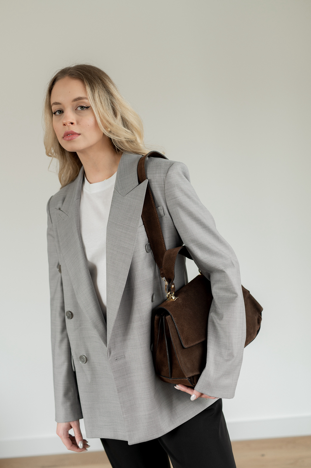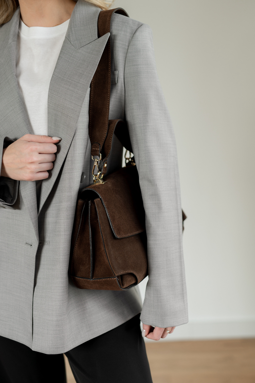 Wyjątkowa, stylowa torebka uszyta ze skory zamszowej. Idealnie sprawdzi się na co dzień (jest bardzo pojemna!) a także przy okazji bardziej eleganckiej uroczystości. W środku dwie przegrody oraz dwie kieszenie zapinane na suwak. Podszewka. Posiada dodatkowy pasek, dzięki czemu można nosić ja na kilka sposobów. Wymiary: wysokość: 23cm, szerkość 32cm, głębokość: 14cm Pasek: 71cm
