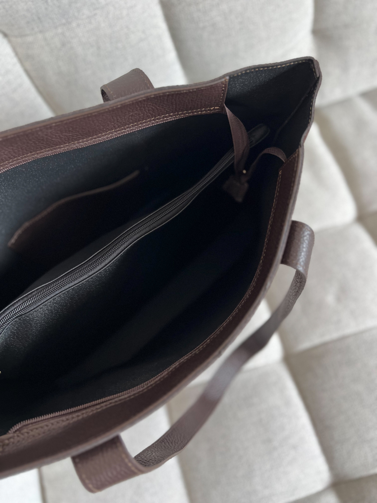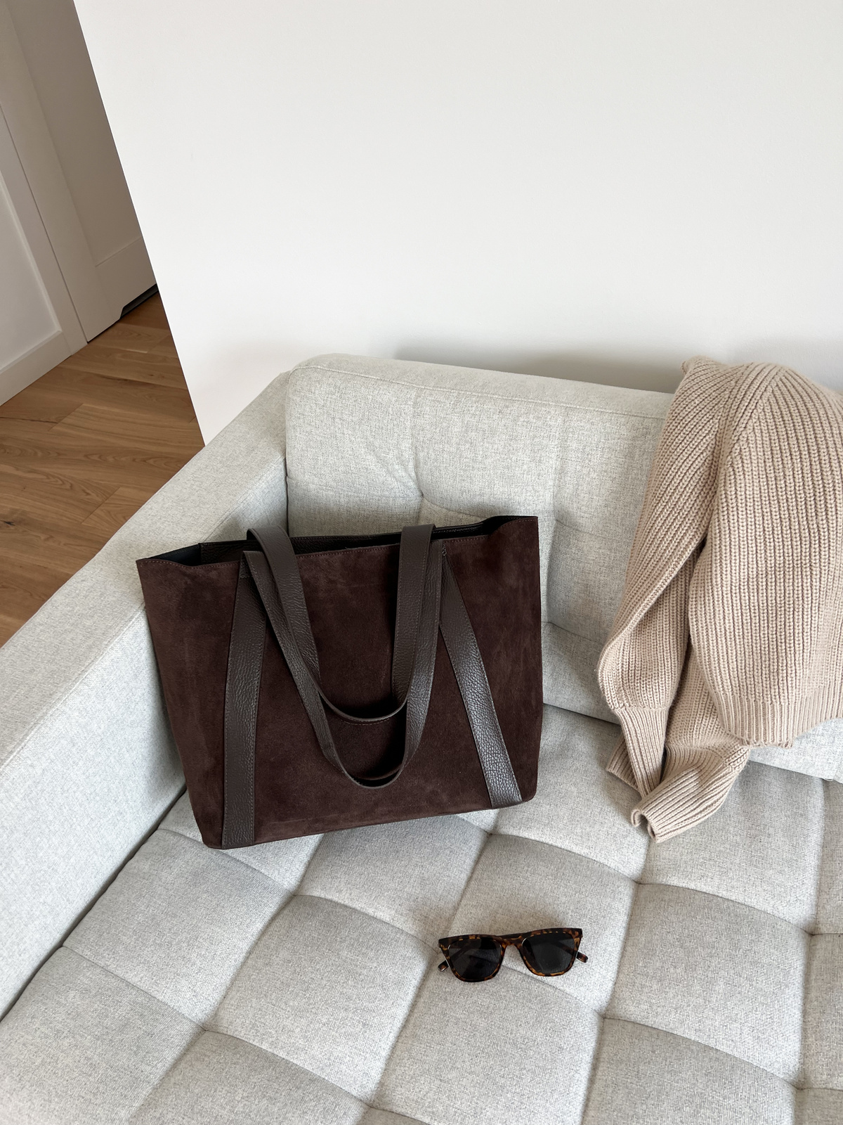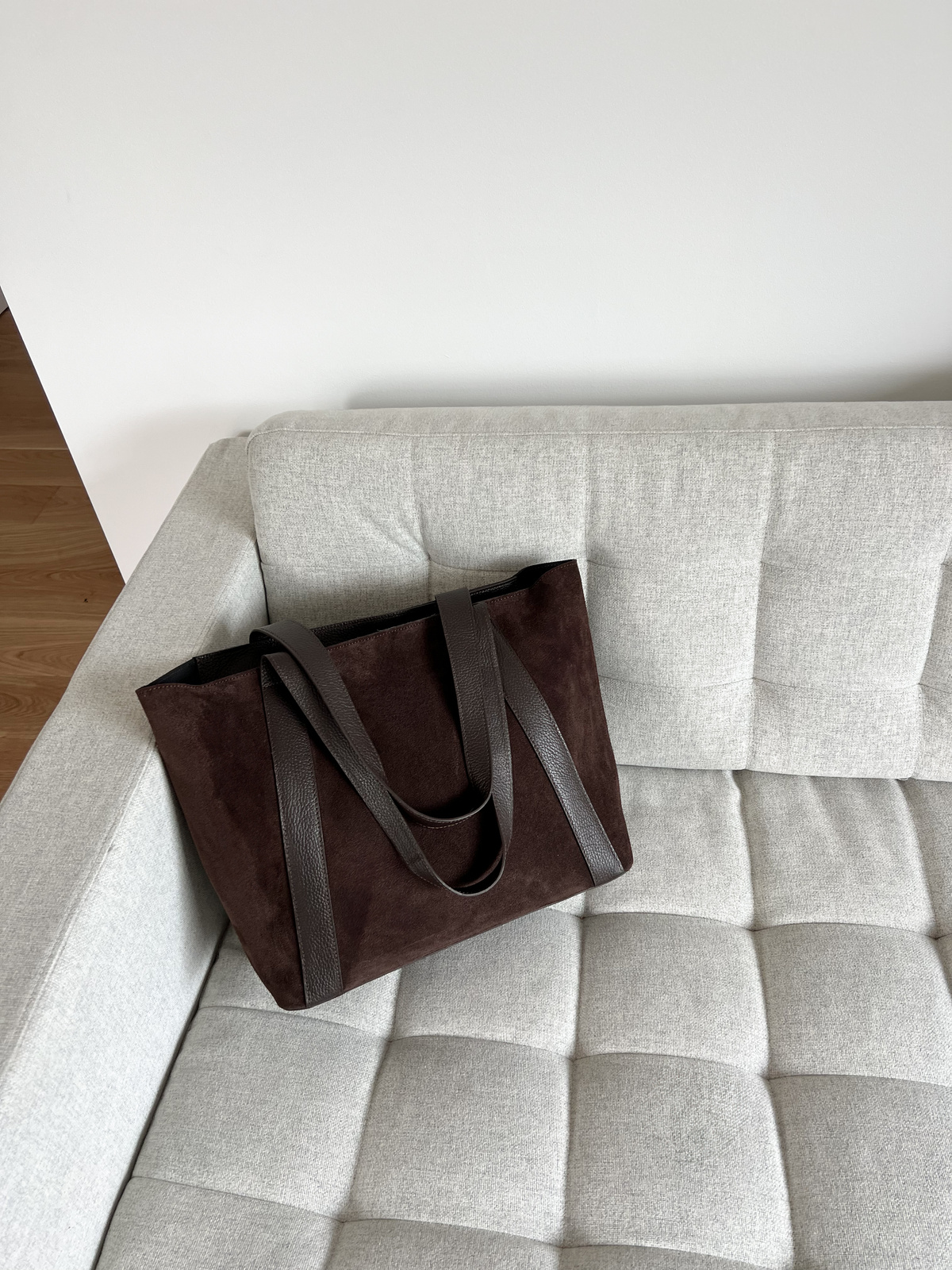 Minimalistyczna shopperka, idealna na co dzień. Pojemna. W środku wyjmowana kosmetyczka, która przyda się, aby pochować drobiazgi. Zapięcie na suwak. W środku dodatkowa mała kieszonka. Pomieści format a4. Uszysta ze skory zamszowej i groszkowej.