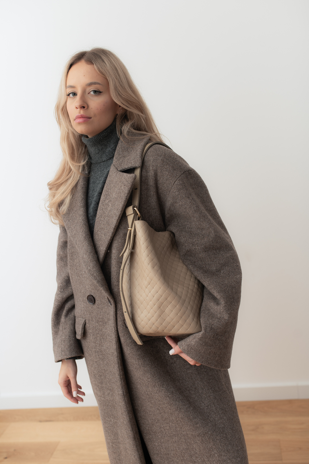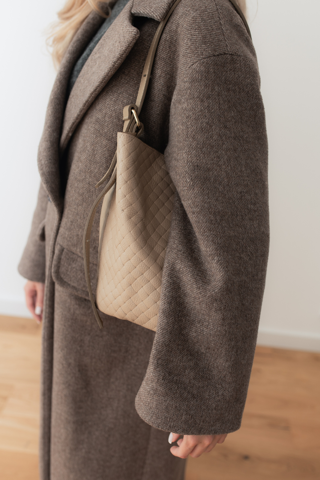 Stylowa shopperka typu worek. Idealnie sprawdzi się w codziennej stylizacji. Pojemna, wygodna. Uszyta ze skóry groszkowej w pleciony wzór.
