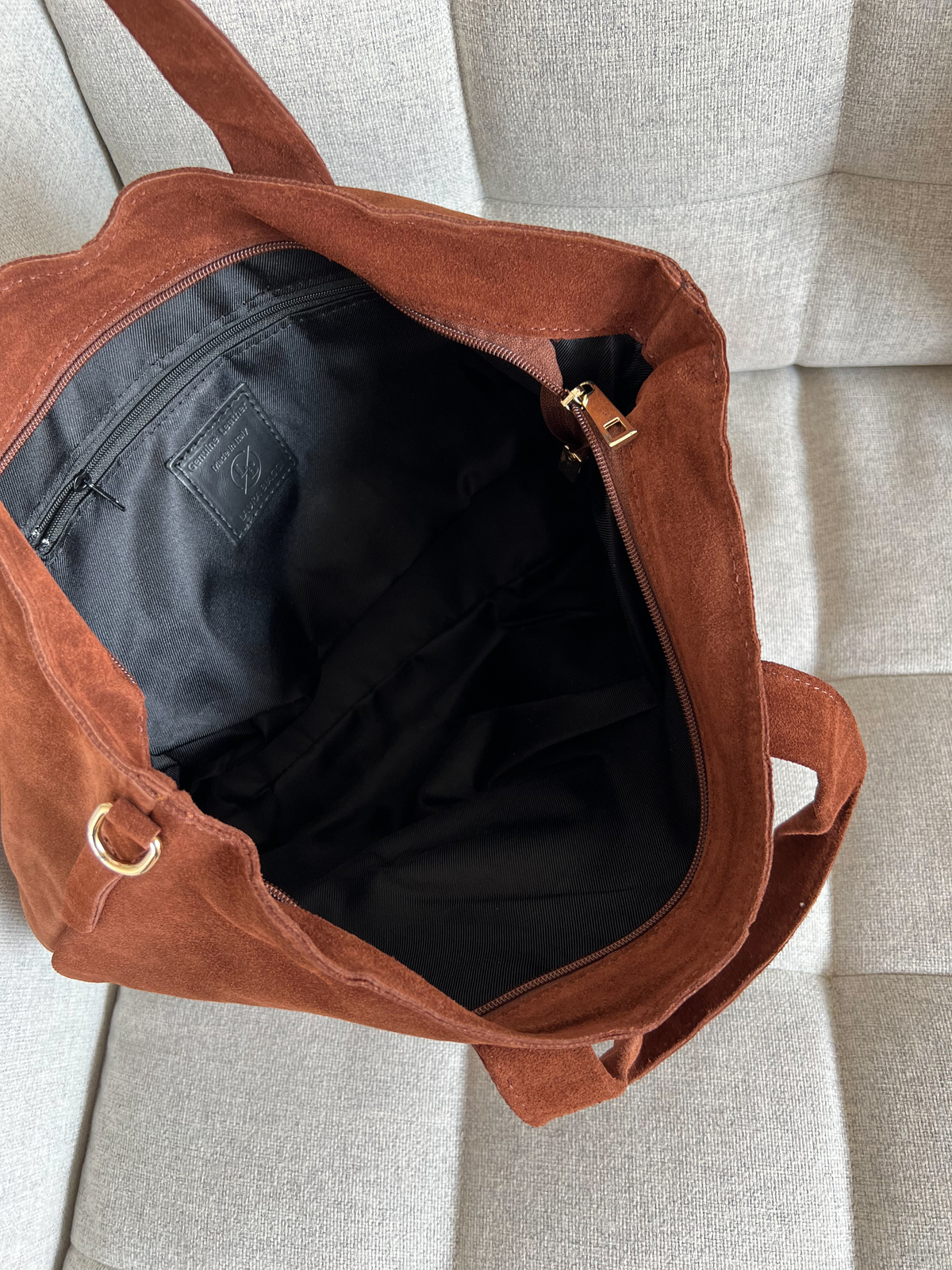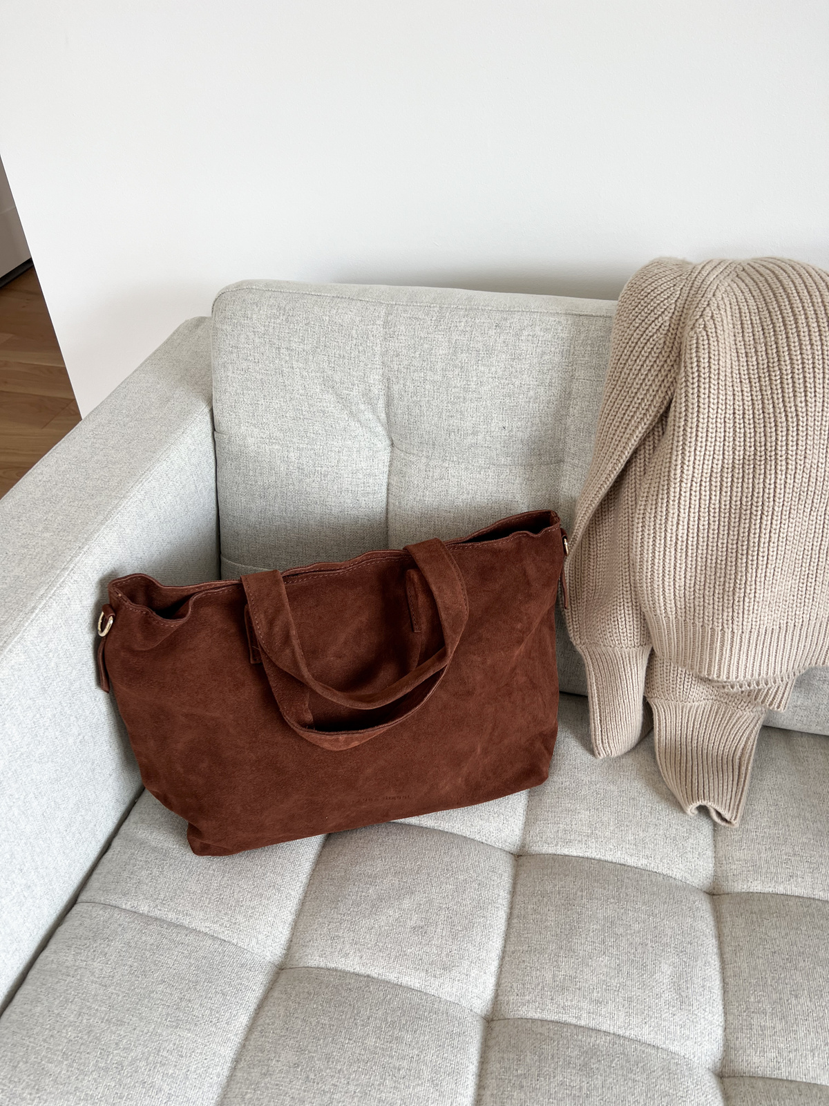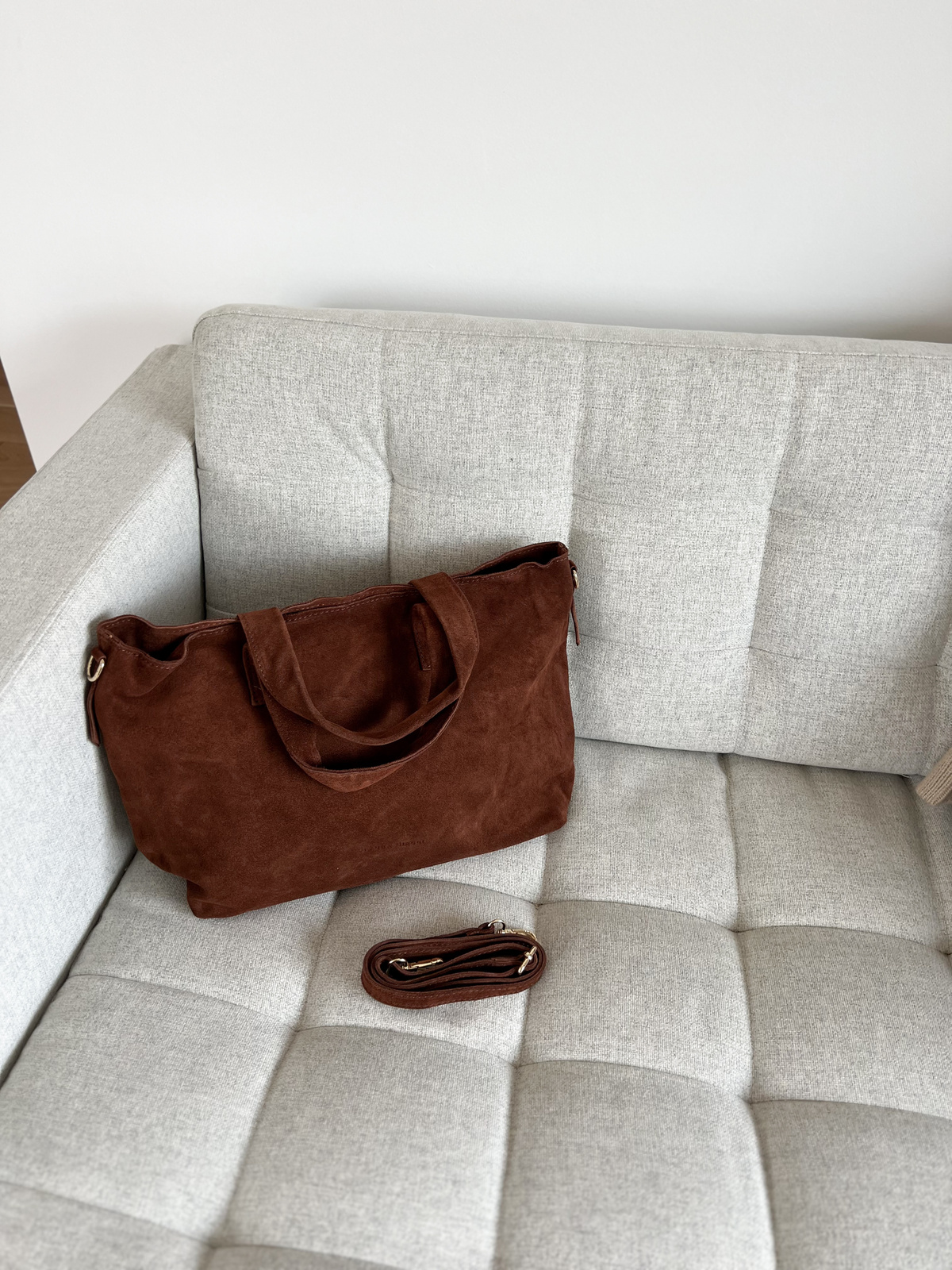 Stylowa, shopperka. Pojemna, wygodna. W środku dwie komory oraz kieszeń na suwak. Posiada odpinany pasek, dzięki czemu można nosić ją na różne sposoby. Uszyta ze skory zamszowej. Wymiary: Mierzona na płasko: wysokość: 26cm, szerokość 48cm. wysokość ucha: 20cm Długość paska: 120cm